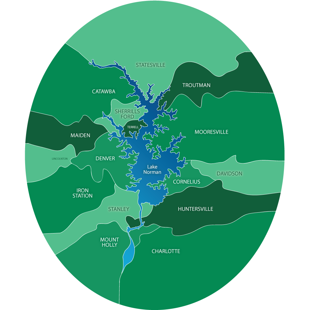 Lake Norman is the largest manmade lake in North Carolina located just 20 minutes from downtown Charlotte, NC. With 520 miles of shoreline, and many unique towns surrounding the 32,000 acres of beautiful water, you will find everything from luxurious waterfront property to pastoral farmland. Lake Norman is country club golf at it's finest, but also the kinetic world of NASCAR. It is stunning new construction and innovative mixed-use development, but also historic downtowns and Revolutionary War landmarks. It's a place to retire and a place to make a start; a place to work and a place to recreate.