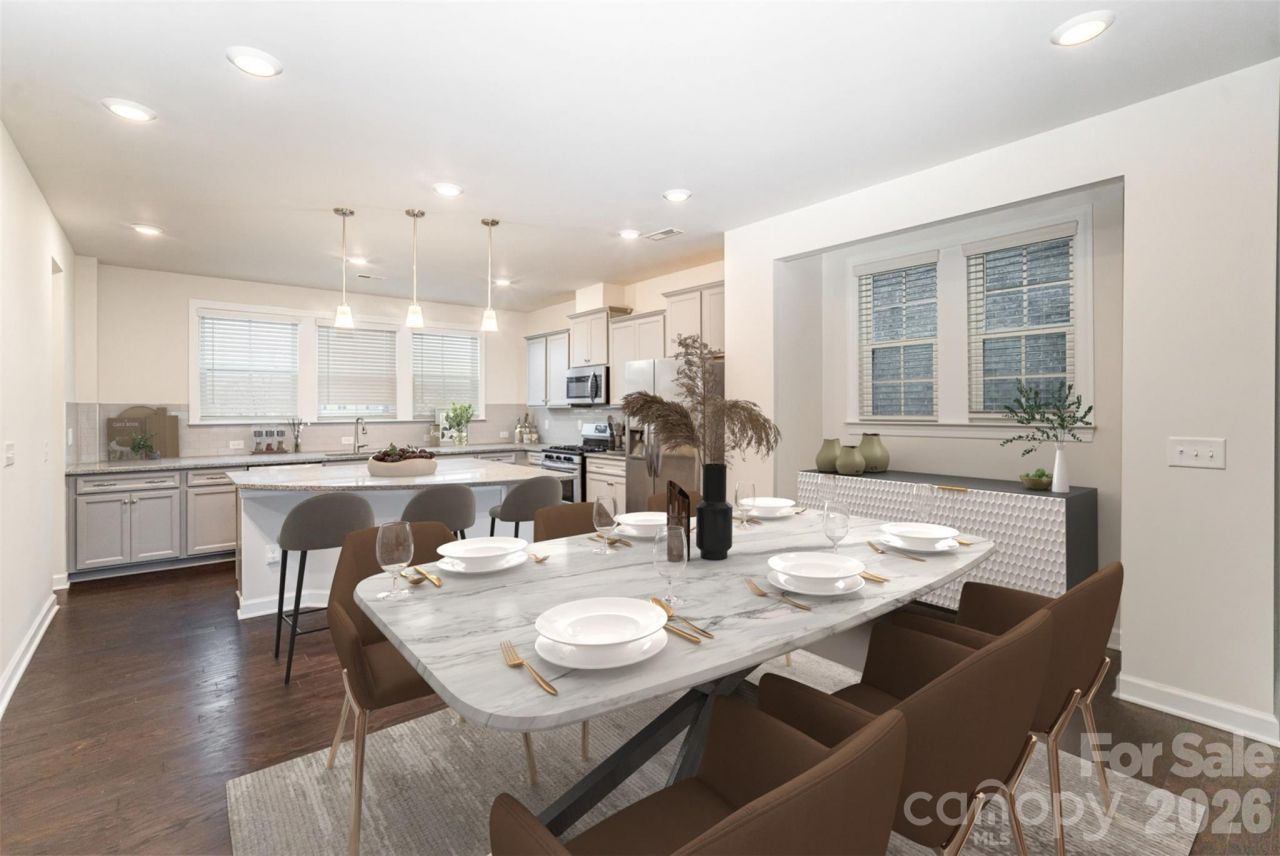 RARE Luxurious all-brick End-Unit Townhome with an oversized 2-car garage in the highly sought-after Rea Farms community. Floor plan offers a plenty of space for everyone along with 4 Bedrooms and 3.5 Baths! The main level includes a versatile bedroom with a full bath, perfect for a home office or guest suite. The second floor boasts a nice kitchen with a large island, quartz countertops, SS appliances, and opening to a dining area and living room. Living Room has access to covered balcony w/ plenty of outdoor space. Primary Bedroom with suite Bathroom having dual sinks, quartz counter and shower. Walk-in closet is a bonus! And two additional bedrooms & 3rd full bath w/comfort for all. Fresh painting, brand new light fixtures in bedrooms and living room. Refrigerator, washer and dryer convey. Minutes to shopping, restaurants, fitness center. Also, easy access to I-485, uptown Charlotte, and the airport.
