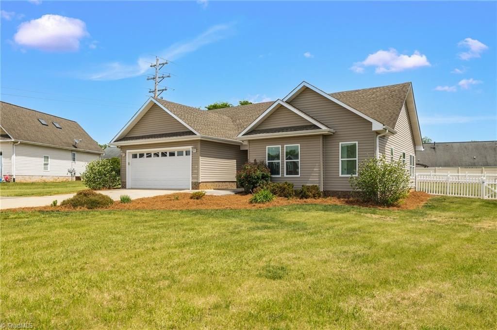 Welcome home to this gorgeous one-level gem in Charleston Ridge tucked away on a cul-de-sac in Mocksville! This inviting open-concept, zero-entry home offers 3 bedrooms and 2 full baths featuring a stunning vaulted sunroom filled with natural light. The modern kitchen shines with granite countertops, a large island, pantry cabinets, and under-cabinet lighting-perfect for everyday living and entertaining. The spacious primary suite includes two closets (one walk-in with a window) and an ensuite bath with a walk-in shower and built-in seat. (Primary bedroom doorways are handicap accessible.) Enjoy outdoor living on the concrete patio overlooking a vinyl picket fenced backyard with a 12'x16' storage building with electrical for your hobbies/tools, etc. Fresh paint, LVP flooring throughout (no carpet!), double garage, and extra parking pad add to the appeal. Conveniently located near charming downtown Mocksville. Refrigerator, TVs, and Speed Queen washer/dryer convey! SEE AGENT REMARKS.