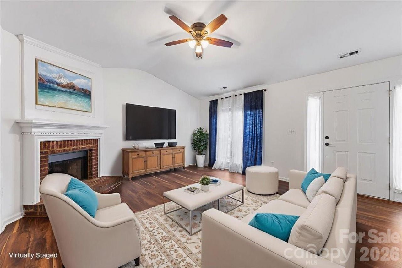 Welcome home to this charming 3-bedroom, 2-bath home in The Crossings at Steele Creek! The inviting family room has vaulted ceilings and a cozy fireplace, creating a warm and open gathering space. The updated kitchen features stainless steel appliances, modern light fixtures, and a bright dining room. The oversized primary suite has vaulted ceilings with a walk-in closet and a beautifully renovated bathroom. Fresh interior paint (2026) and new bedroom carpet (2026) provide a move-in ready feel, while the spacious laundry room adds everyday convenience. Step outside to a private backyard complete with a new fence and a storage shed that conveys with the home. Residents enjoy community amenities including an outdoor pool, clubhouse, playground, recreational areas, and walking trails. Ideally located near shopping, dining, and the airport, this home combines comfort, style, and convenience in one exceptional package.
