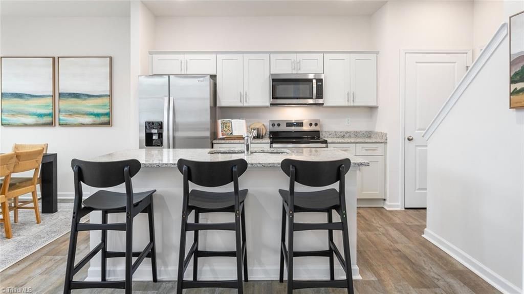 The Pattison in North Village Townes, located in Greensboro, NC, is a 2-story townhome with 4 bedrooms, 2.5 bathrooms, 1,658 sq. ft., and a 2-car garage. The open-concept design combines the kitchen, living, and dining areas, creating a great space for entertaining. The kitchen features shaker-style cabinets, granite countertops, and stainless steel appliances. Upstairs, the primary bedroom has a spacious walk-in closet and an ensuite with a walk-in shower, dual vanity, and quartz countertops. Additional rooms offer flexible spaces for home offices or bonus areas. Relax on the back patio. Contact us for a tour!