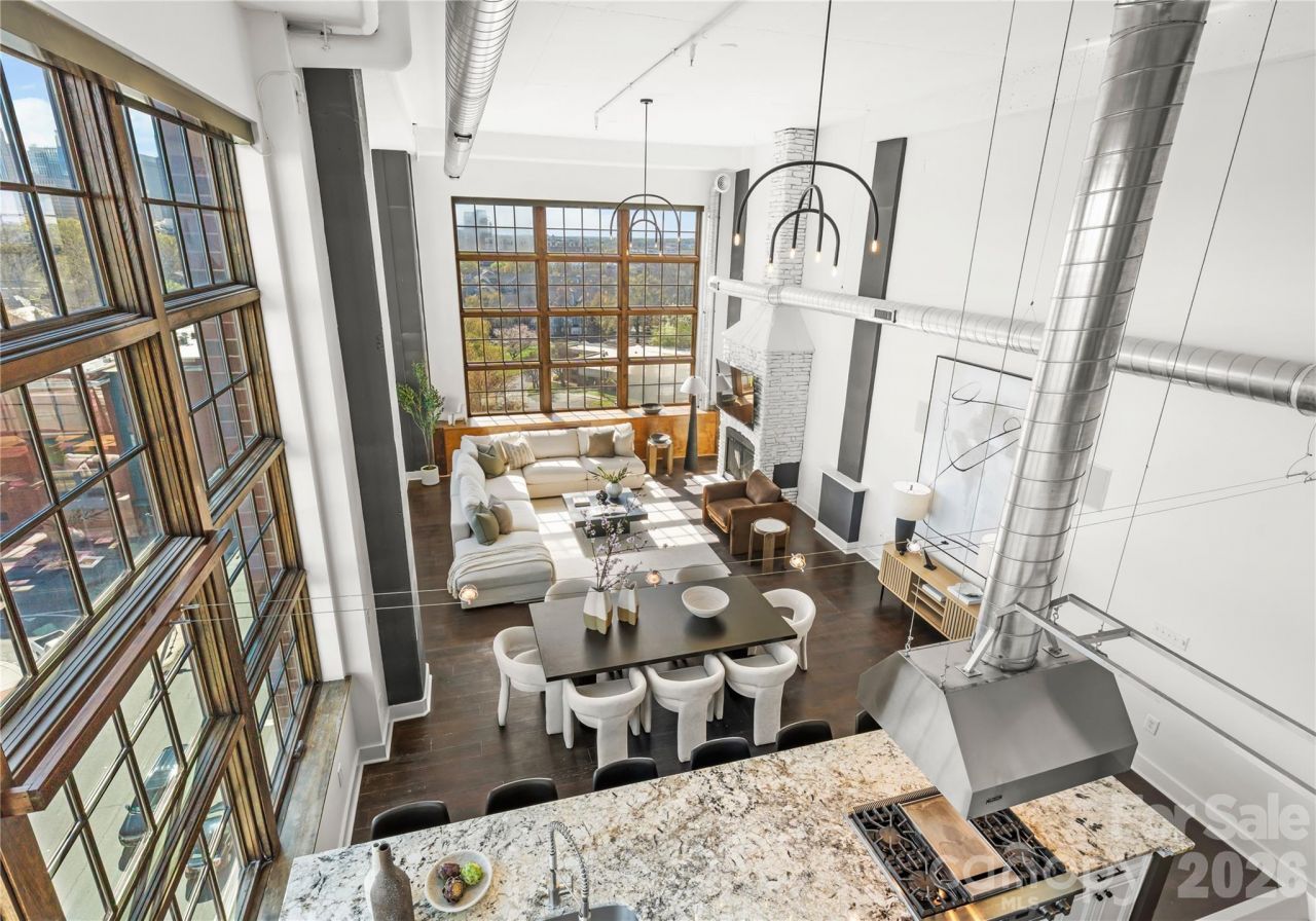 Welcome to The Penthouse at The Garrison at Graham?one of Uptown Charlotte's most distinctive and architecturally striking residences. Occupying the prime top-floor corner of the building, this remarkable three-story penthouse spans approximately 2,750 square feet of sophisticated loft-style living and is framed by two dramatic walls of 12-foot floor-to-ceiling windows that flood the home with natural light while showcasing breathtaking panoramic views of the Uptown Charlotte skyline. With the touch of a button, motorized shades reveal sweeping city vistas that transform throughout the day?from morning light pouring into the living spaces to dramatic sunset and twilight skyline views. The main living level offers a truly impressive sense of scale with soaring two-story ceilings, expansive window walls, and rich wood flooring that flow throughout the open-concept living and dining areas. A gas fireplace anchors the living space, creating warmth and ambiance while maintaining a sleek modern aesthetic. The layout is thoughtfully designed for both everyday living and elevated entertaining. The chef's kitchen serves as the heart of the home and features a massive center island with granite countertops, stainless steel appliances including gas range, oven, microwave, beverage refrigerator, dishwasher, and exhaust hood, along with abundant cabinetry and prep space ideal for hosting gatherings. The open floor plan seamlessly connects the kitchen to the living and dining areas, allowing guests to gather comfortably while enjoying the skyline views beyond the windows. The second level features two spacious guest suites or flexible office spaces, each with its own full en-suite bathroom, offering privacy and versatility for guests, work-from-home needs, or additional living space. A private sauna adds a spa-inspired element rarely found in Uptown residences. A mid-level flex space with an additional full bathroom offers even more versatility?perfect as a media lounge, secondary office, fitness room, or guest bedroom depending on your lifestyle needs. The top floor is dedicated entirely to the owner's retreat, creating a private sanctuary above the city. This level features a generous primary suite, spa-like bathroom, and expansive walk-in closet, offering a quiet escape while still enjoying the dramatic skyline backdrop. The crown jewel of this penthouse is the extraordinary private rooftop terrace?your own backyard in the sky. Designed for elevated outdoor living, this expansive terrace includes a covered outdoor living room with gas fireplace, built-in stainless outdoor kitchen, and an artificial turf lounge area that creates a rare and inviting urban outdoor experience. Whether hosting sunset gatherings or enjoying quiet evenings overlooking the skyline, the terrace offers a truly unforgettable setting.Additional highlights include four assigned parking spaces in the secured garage (two primary spaces equipped with vehicle lifts), alo