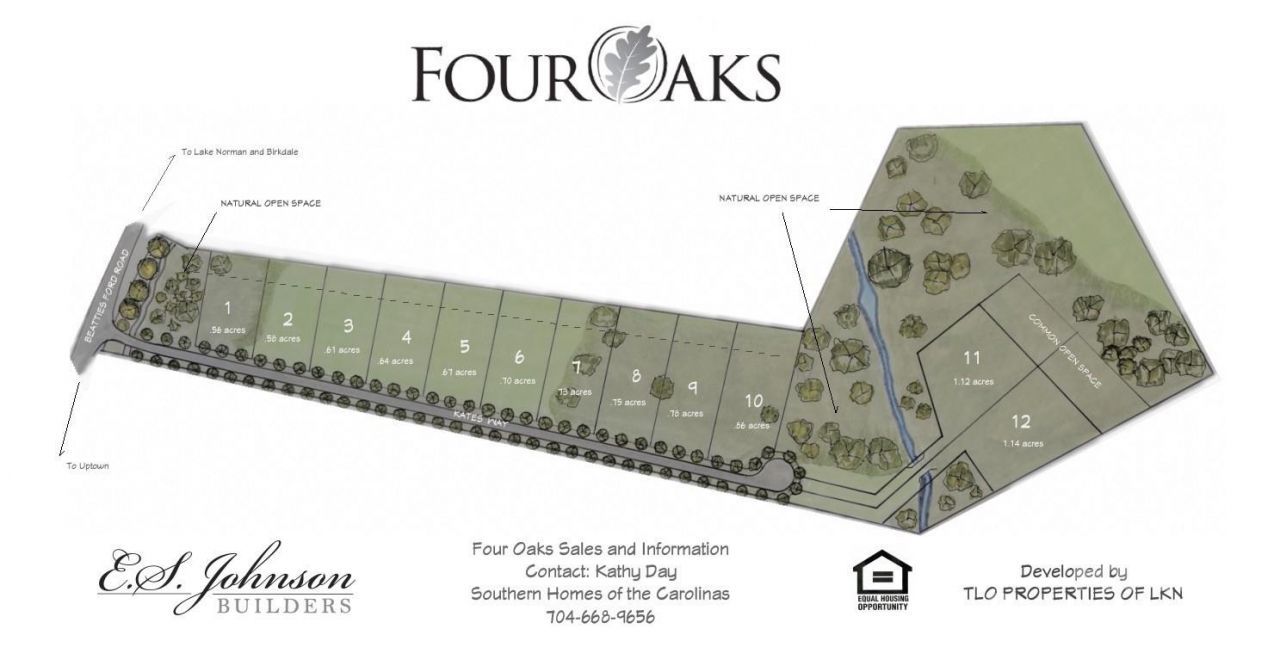 Proposed new construction home to be built by ES Johnson Builders in the new community of Four Oaks. This proposed home, called Ivy Thistle is the answer for a simple, yet elegant home that harkens us back to another time. The main floor is meant to feel large and open. The front entry welcomes you into a two-story area with a breathtaking staircase made of wrought iron newels and balusters and white oak handrail. The white oak is continued throughout in the extra wide hardwood floors. The kitchen is the hub of the downstairs as it overlooks the rear yard, dining, and family spaces. The chef of the family will enjoy the commercial appliances and the nearby scullery which spills out to a dedicated grilling terrace. As we continue in the primary suite you met with large windows that have a great view of the rear yard. Look up and see an elegant, vaulted ceiling with beams. Large vanities, two headed shower and large pedestal tube invite you to relax. The upper floor is made to accommodate the modern growing family. Each bedroom has its own bath. Bedroom #3 is made as a bunk suite for that visiting family or a large family. The large bonus room and flex space allows you extra space and the opportunity to customize your home to your entertainment needs. Located in the desirable area of Huntersville, minutes to shopping, retail, Birkdale Village & Lake Norman.